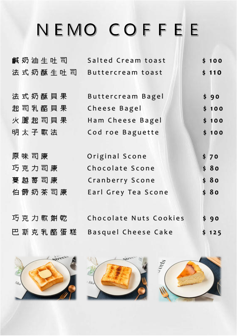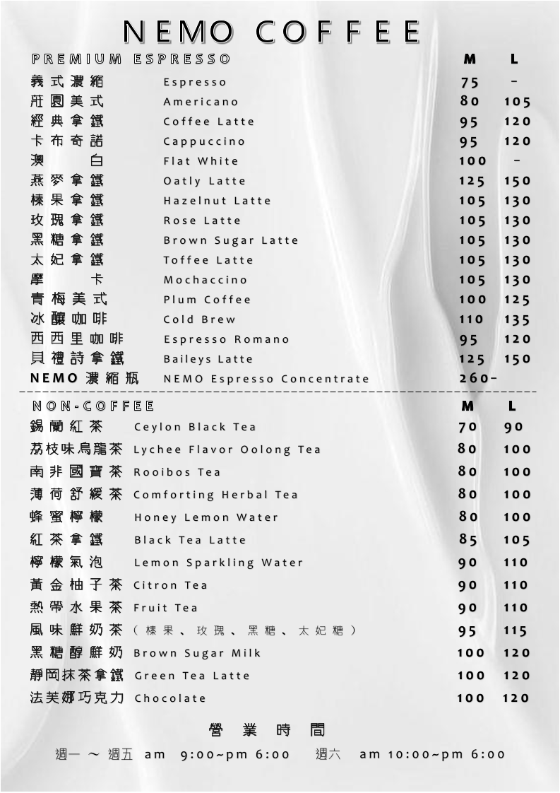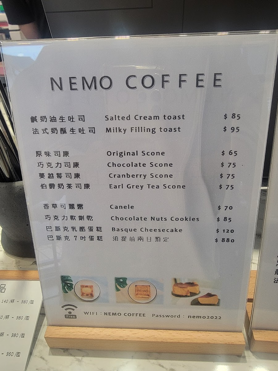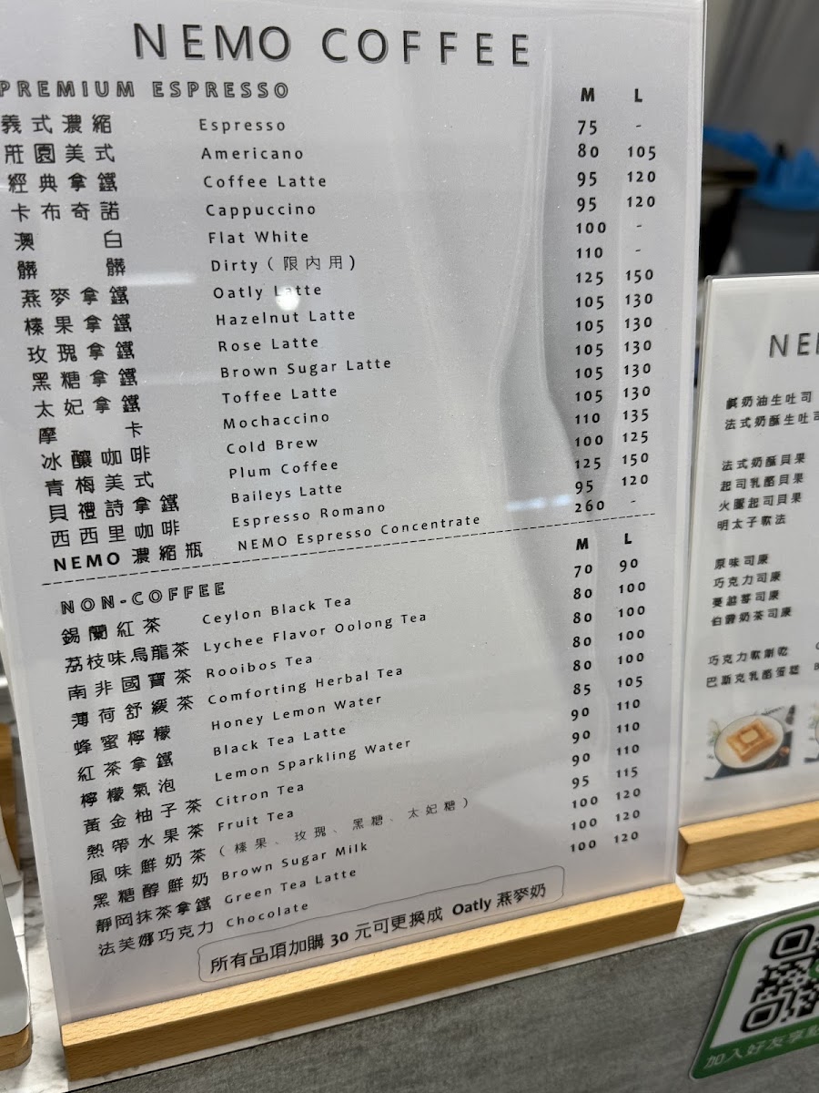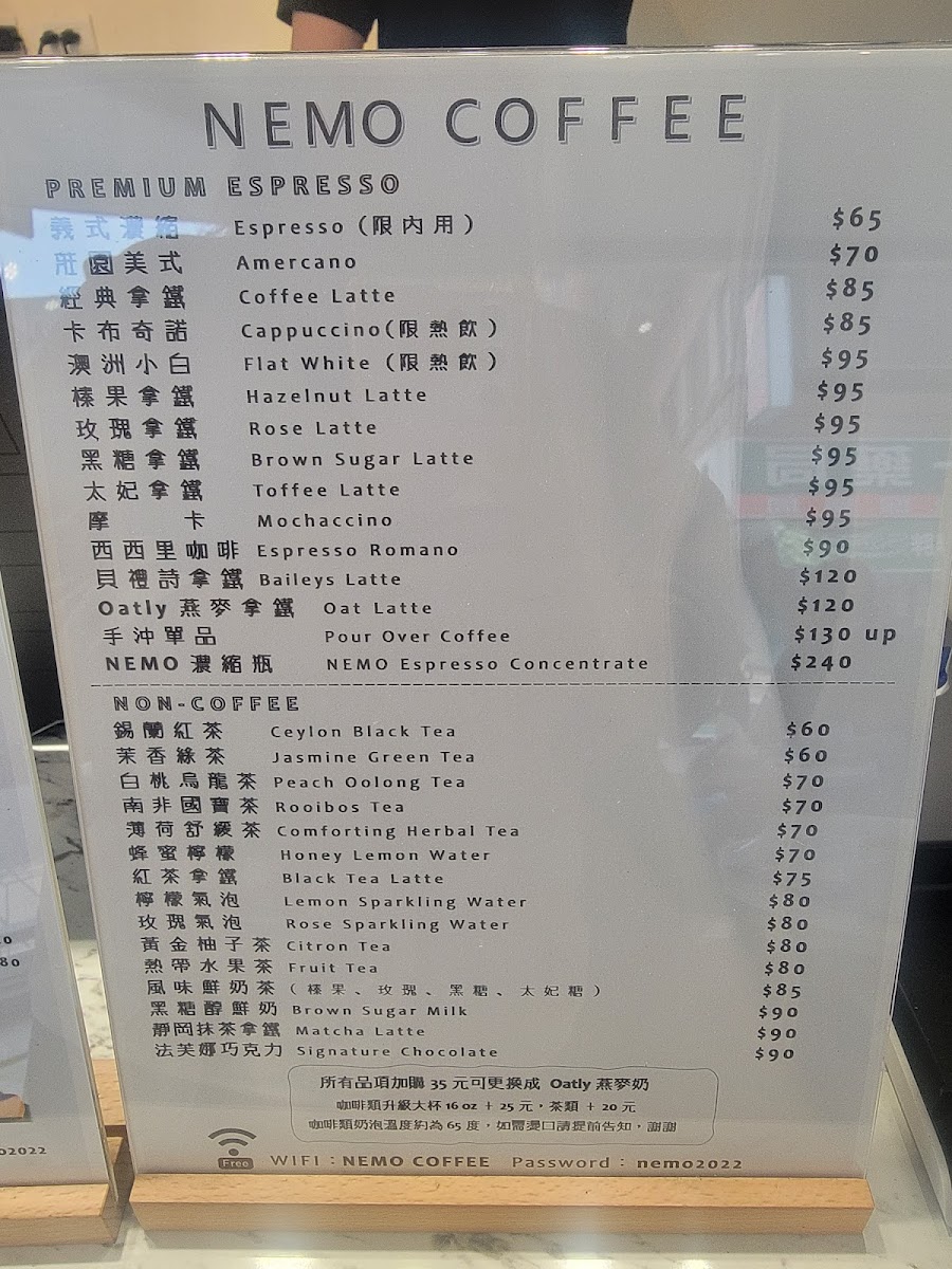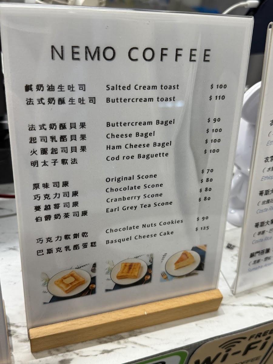 Welcome to NEMO COFFEE, your cozy retreat tucked away in the heart of Taipei's Songshan District. This charming café offers a thoughtfully curated menu that features standout beverages like the rich, no-sugar Americano (NT$98) and the classic Coffee Latte (NT$118), both customizable in sweetness and intensity. For a unique experience, try the NEMO Espresso Bottle (NT$290), a high-concentration espresso perfect for crafting personalized drinks at home.